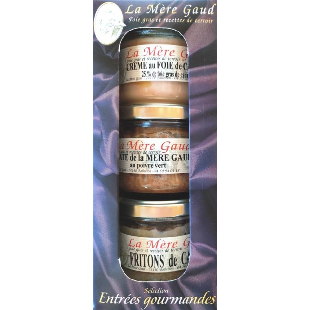 Les lots 3*180g sont composés de 3 bocaux en verre 180g de crème de foie, de pâté de la Mère Gaud au poivre vert et de fritons de canard.